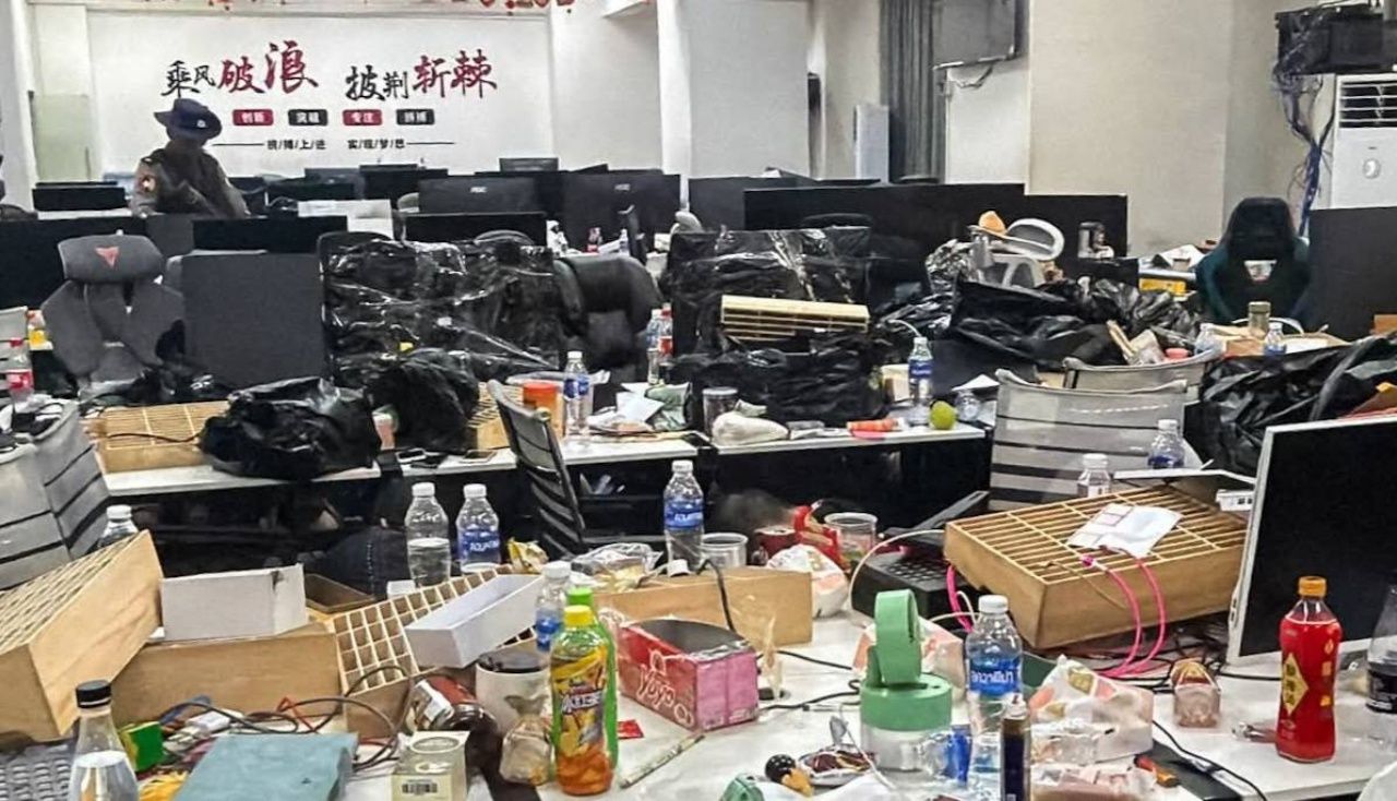 缅甸官员进入多层建筑的各个房间,每个房间内都有电脑、手机和电器设备,设有桌子,每个房间有超过30台设备。此外,还有因害怕官员而藏身于电脑桌下的诈骗人员,最终被自愿拘捕。