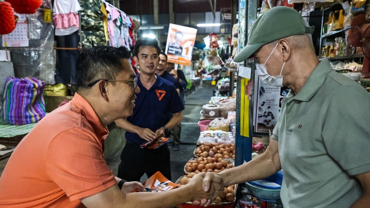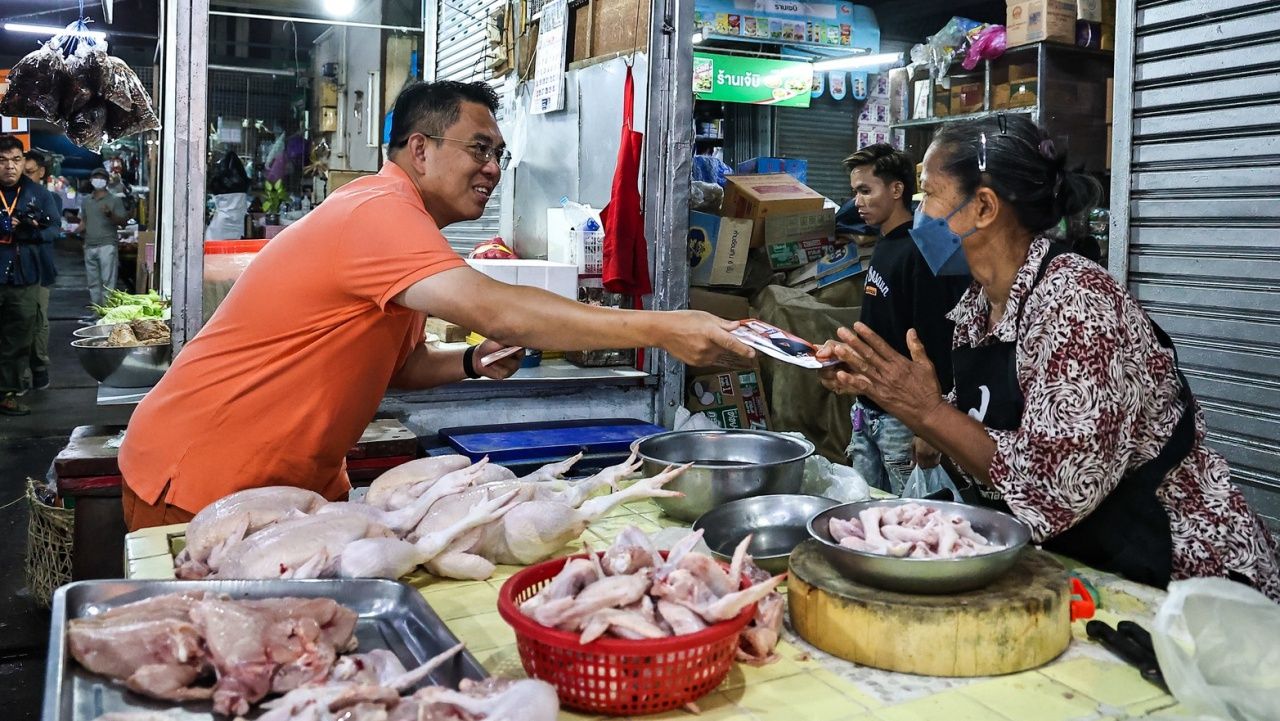 1月12日,民众党名册候选人维洛・拉卡纳特对抗到曼谷邦邦-钟同-挪潜区域协助第28区的候选人展开竞选,热情的民众穿上橙色衣服挥手致意并请求握手。维洛特别强调了解决电话犯罪集团、老人福利和中小企业支持政策。